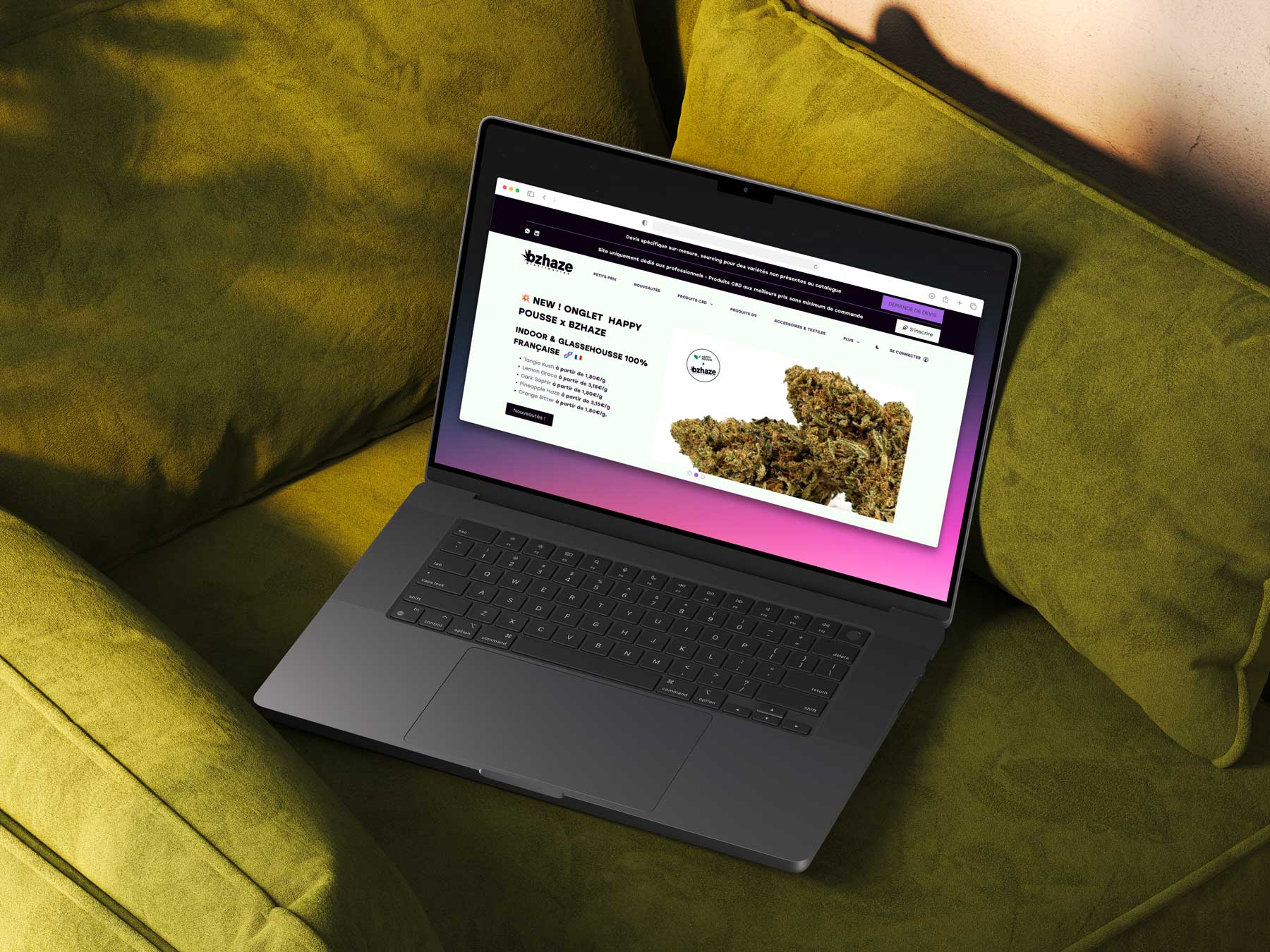 Au-delà du SEO, nous avons conçu une identité visuelle et éditoriale qui tranche avec les codes habituels du marché CBD. La plupart des grossistes misent sur une esthétique générique, des visuels stock et un ton impersonnel. Bzhaze affirme un ancrage territorial fort, la Bretagne, une production propre avec des génétiques exclusives cultivées en indoor, et un positionnement premium qui se ressent dans chaque élément du site.